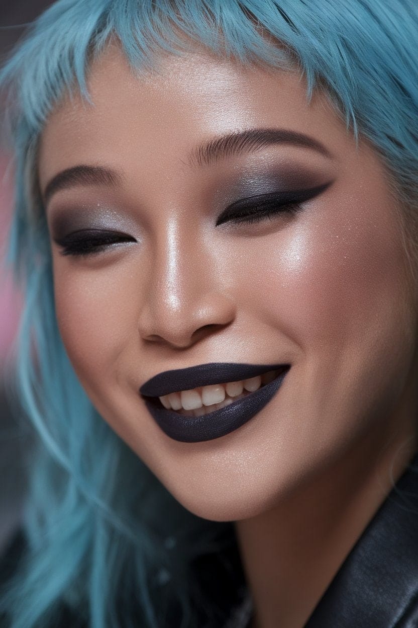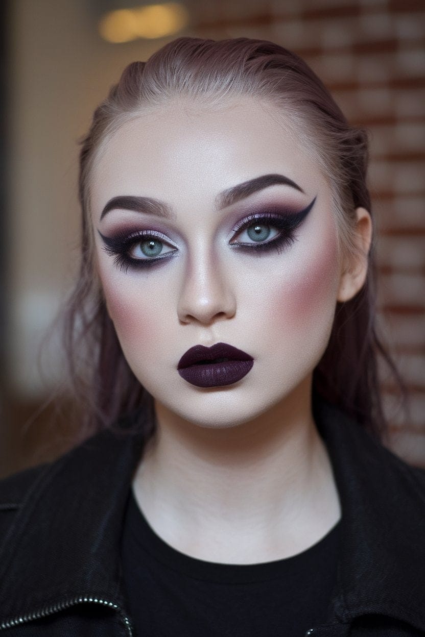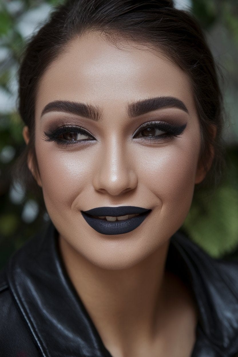 Deep, dark lipstick is a must. Choose rich burgundies, deep purples, or classic black for a striking look. Pair with defined brows and subtle contouring.