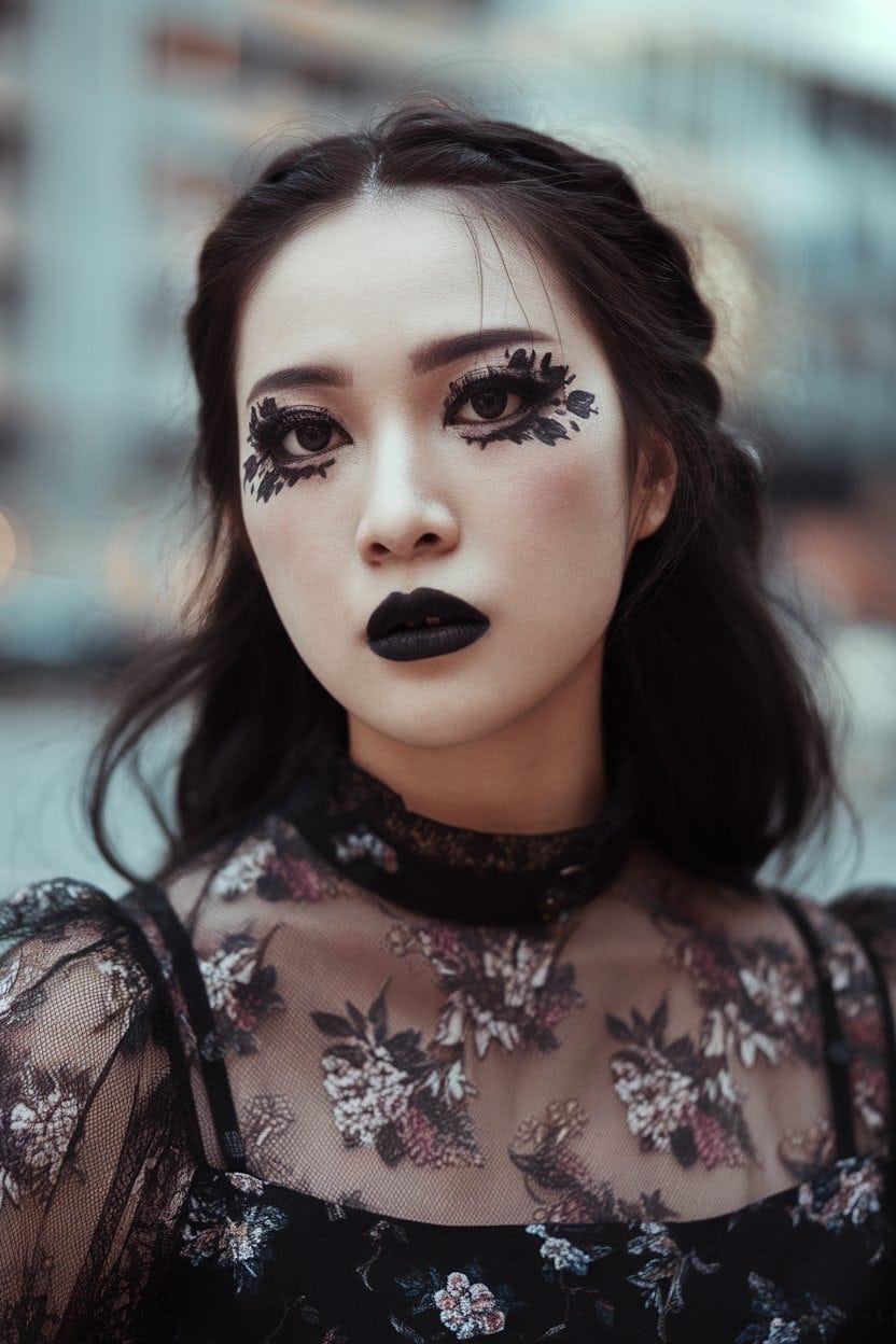 Eye accents take center stage in this bold look. You’ll want to focus on intricate designs around your peepers. Think swirling patterns, delicate dots, or even tiny flowers framing your eyes. Use fine-tipped eyeliners or small brushes for precision.