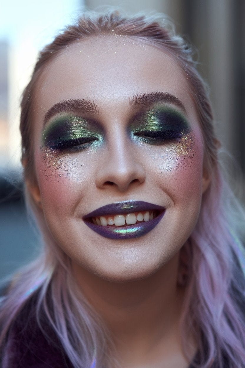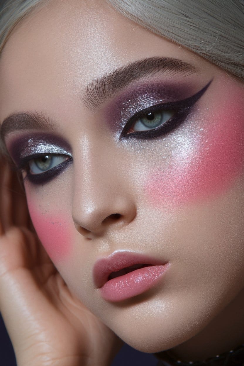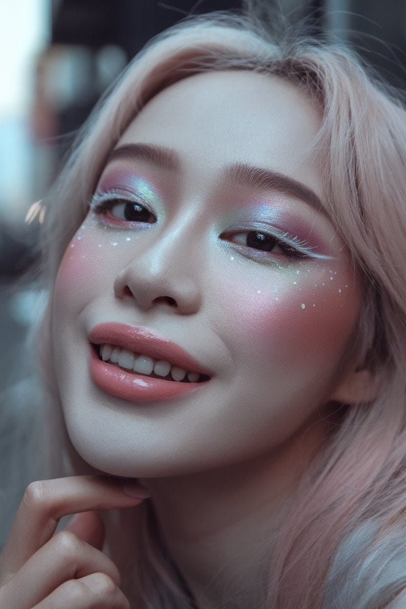 Complete the look with a pale lavender or cool-toned pink lip gloss. This creates a cohesive, otherworldly appearance that’s both eye-catching and subtle.