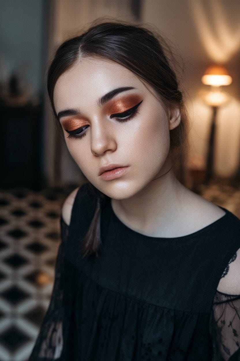 For extra drama, try adding a copper chrome eyeliner along your lash line. This creates a striking contrast against your skin. Pair it with a nude lip to keep the focus on your eyes.