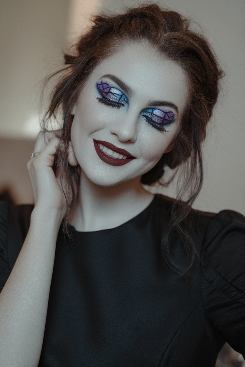 Stained glass eyes create a mesmerizing, artistic look that’s perfect for special events or festivals. You can achieve this effect using vibrant, translucent eyeshadows in various hues. Apply them in geometric patterns across your eyelids to mimic the appearance of colorful glass pieces.