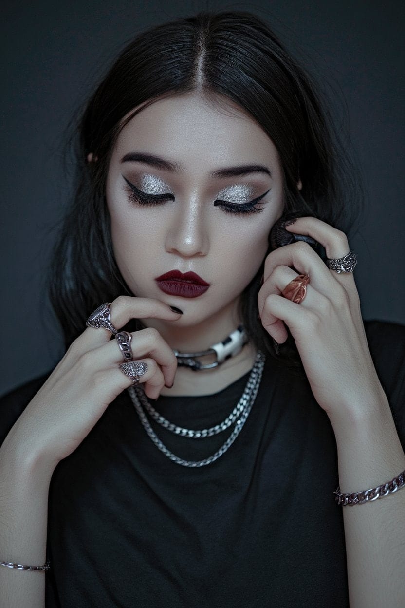 Gothic glam blends dark elegance with dramatic flair. You’ll want to start with a pale foundation base, slightly lighter than your natural skin tone.