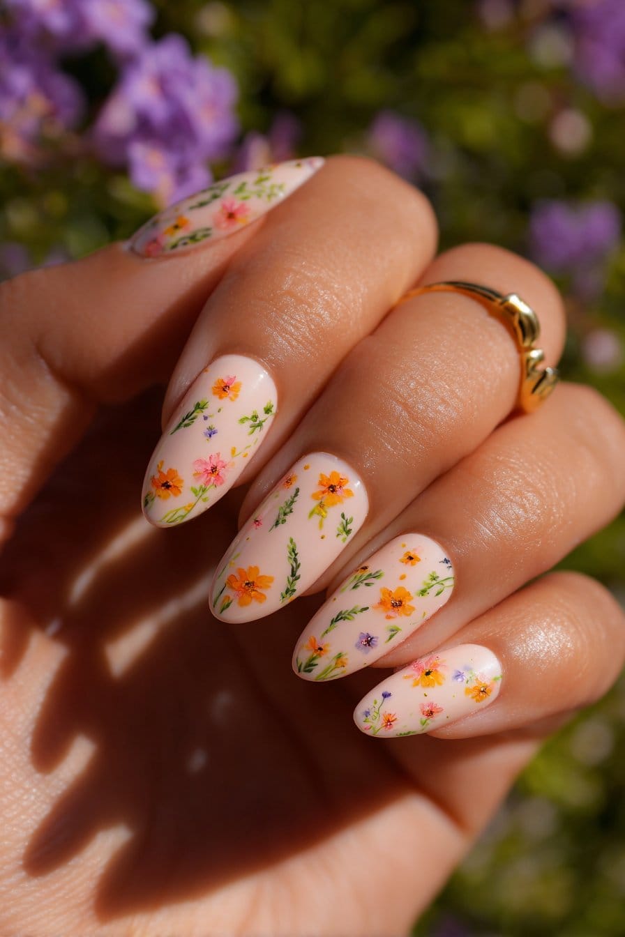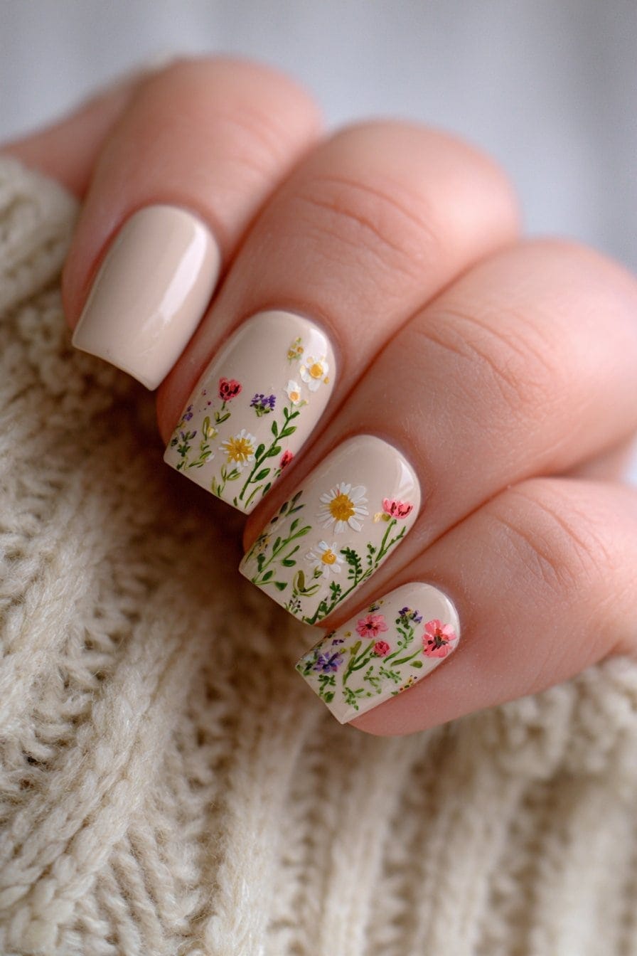 If you add a few hand-painted wildflower bouquets on some nails, it really breaks up the neutral background. Each flower brings a bit of that countryside vibe; not too much, just enough to make you smile.