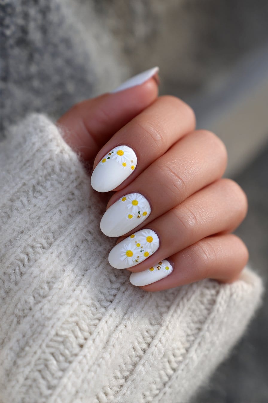 Start with a neutral polish base, then add tiny white daisies like little graffiti tags. It’s got that handmade, slightly imperfect look that feels more real than polished.