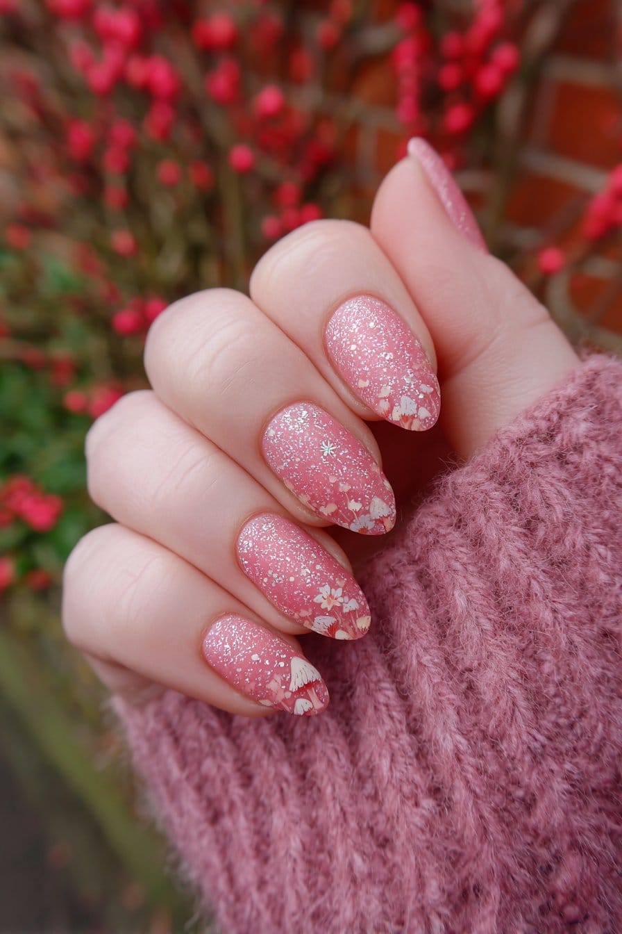 Tiny mushroom clusters add instant cottagecore vibes. The little fungi details break up the pink and make things playful.