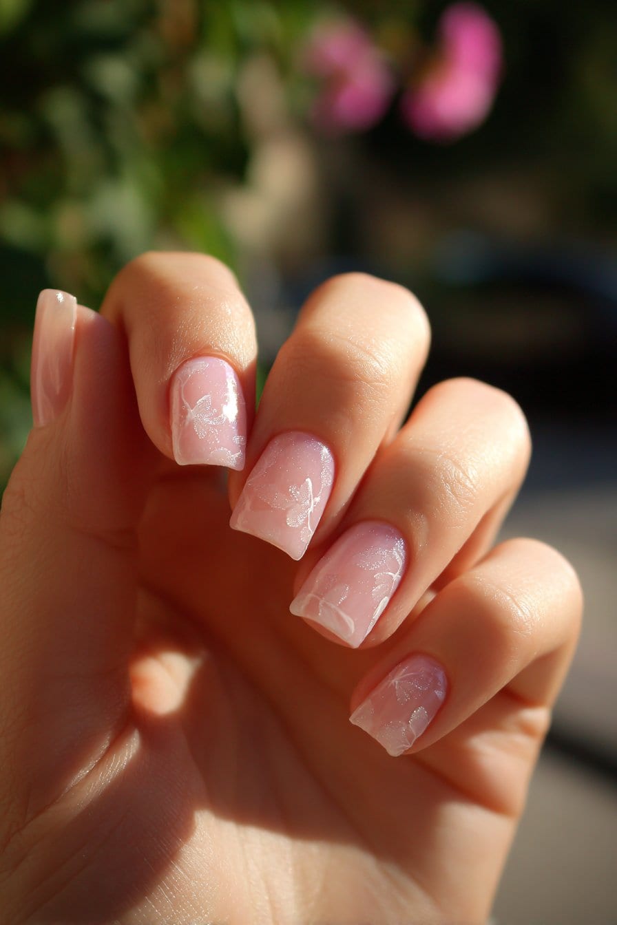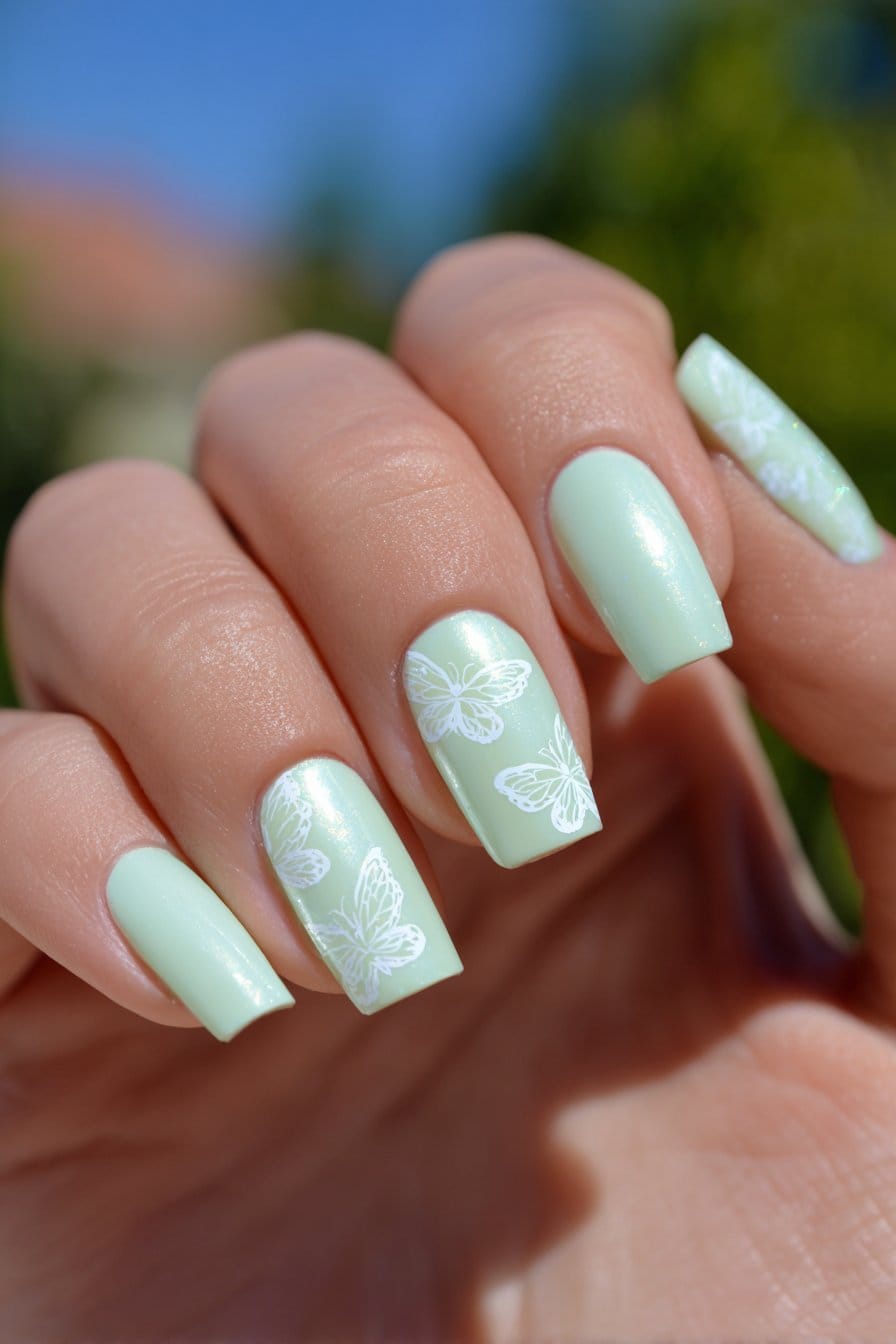 Add faint butterfly silhouettes for a dreamy look. The shapes are minimal, so your nails keep that quiet charm but still show detail.