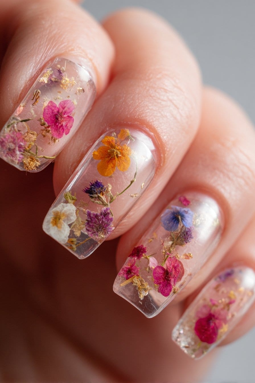 Mix in small pressed flowers with clear gel for a soft but edgy vibe. The flakes don’t take over, they’re just little accents inside.