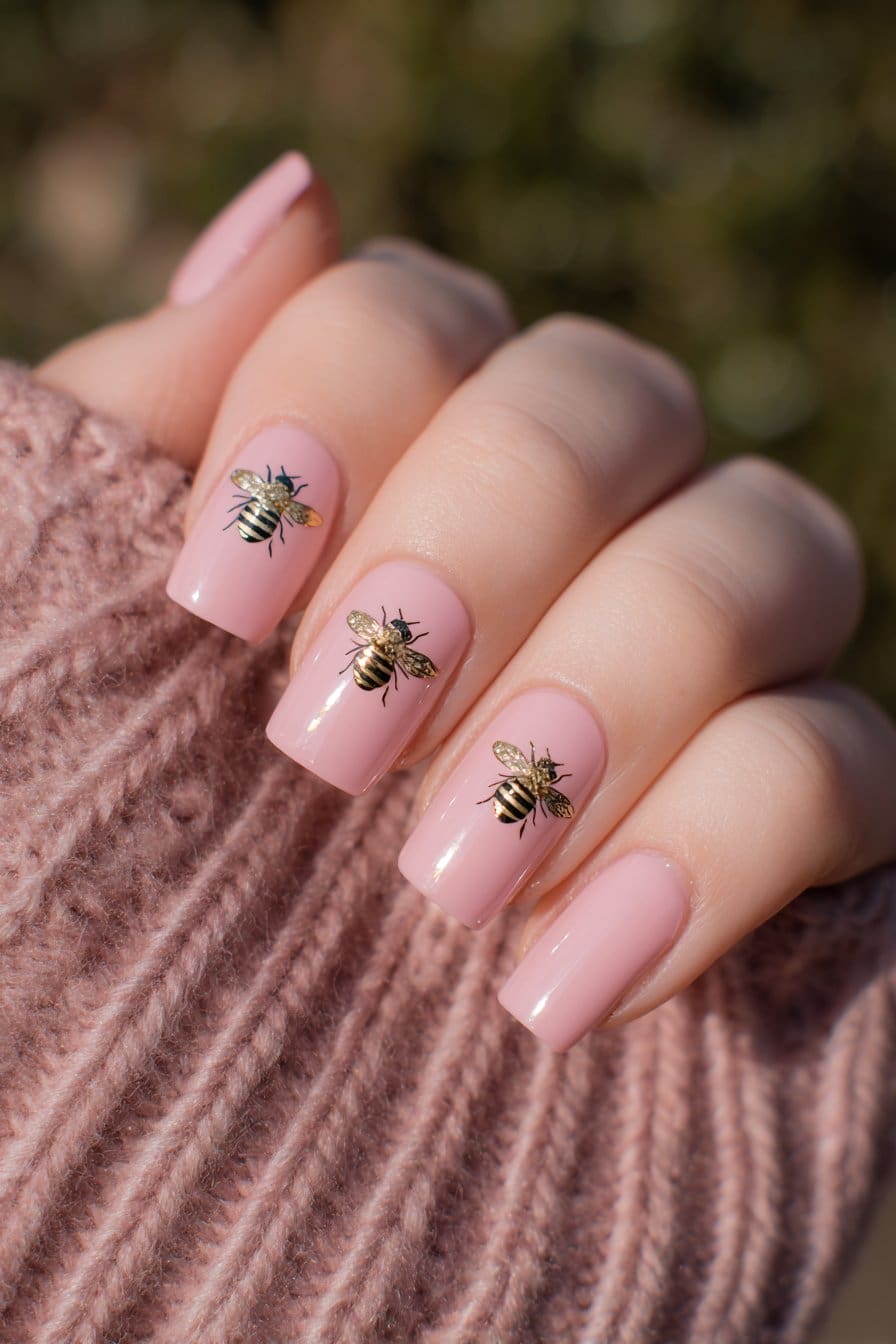 Add a few tiny bees with detailed wings and stripes. They pop against the peach and give your nails a quirky edge.