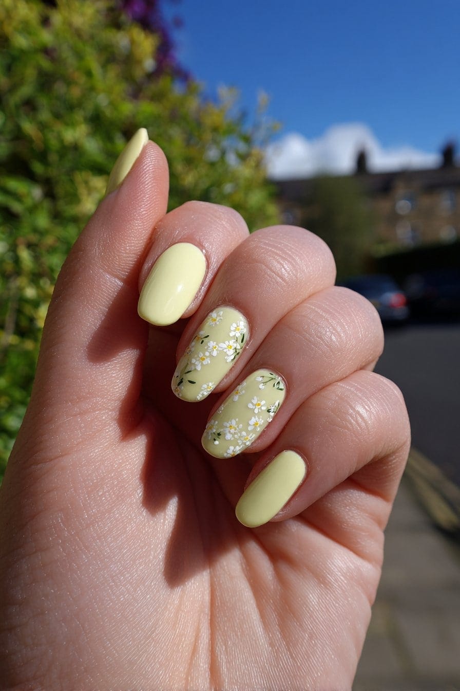 A soft pastel yellow base makes your nails look instantly lighter. The color feels easygoing but not dull.