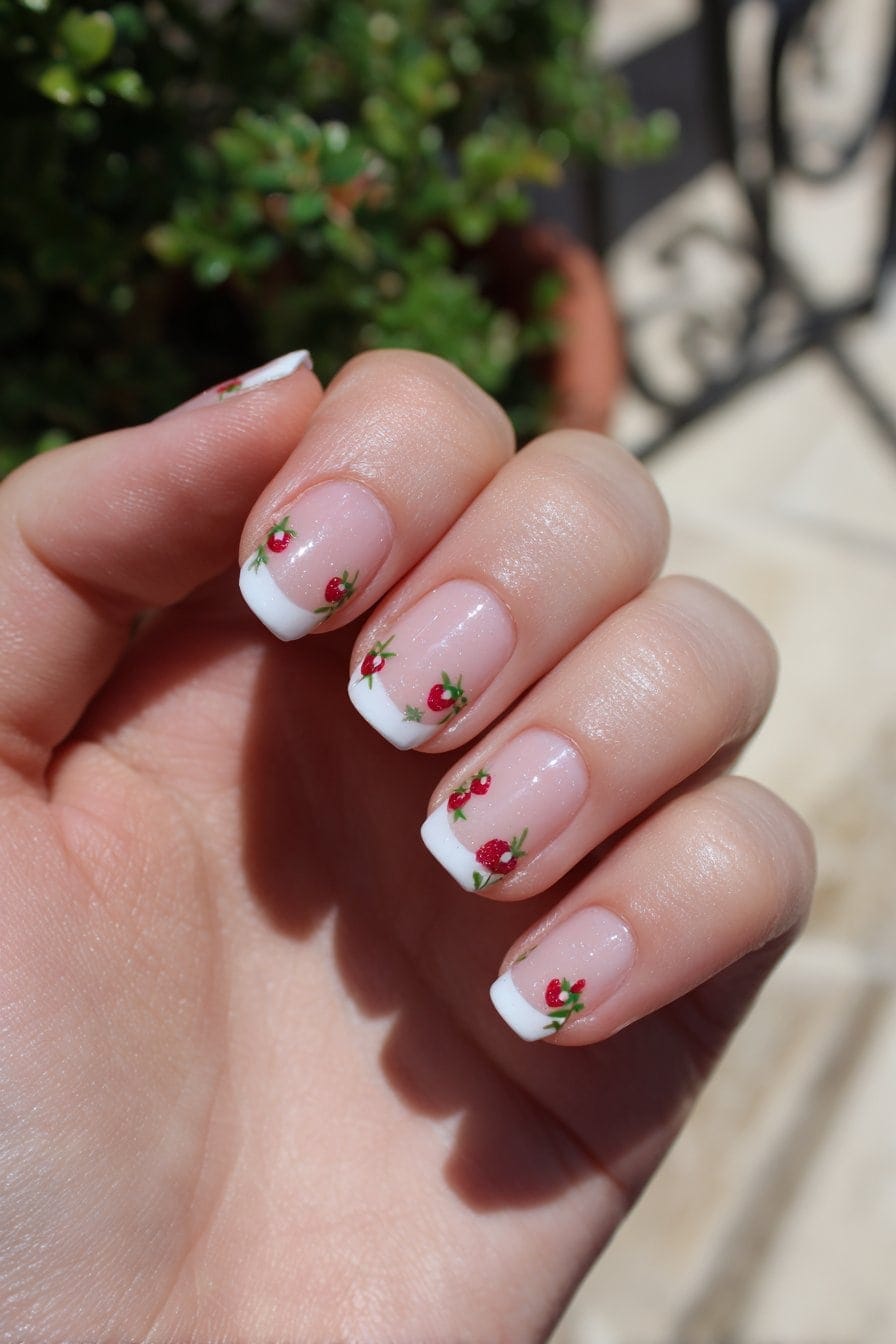 Take the classic French tip and add tiny strawberries near the edges. The combo of white tips and red berries feels playful but still neat.