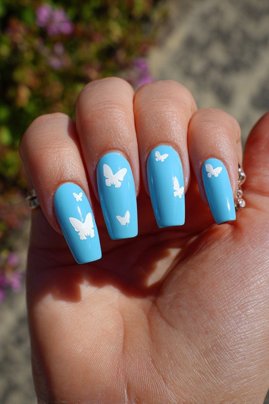 Now, add in those tiny butterfly wing patterns, almost like someone doodled them right on your nails. They’re subtle, not too busy, just enough to keep things interesting and not totally predictable.