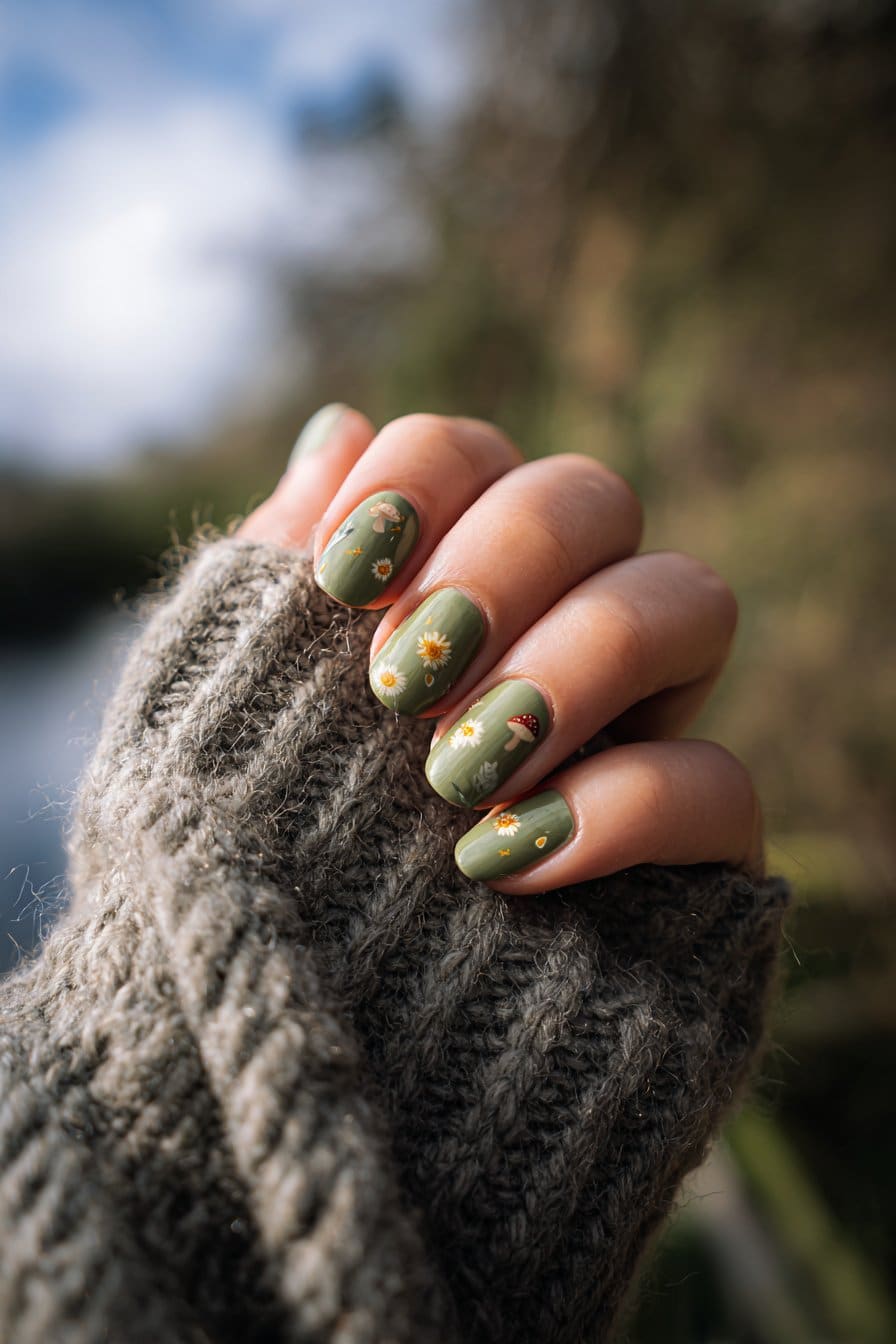 Add a couple of tiny mushrooms to one or two nails for a playful touch. They break up the solid green and hint at woodland vibes.