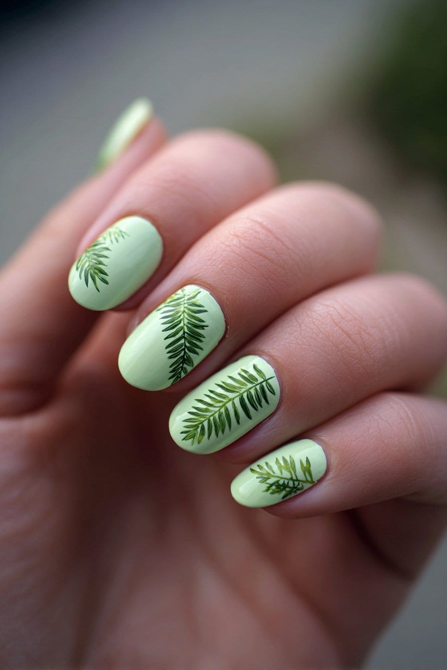 Add thin fern designs in a darker green for a bit of that cottage core vibe. The leaves look sharp but still natural, giving your nails an earthy feel.