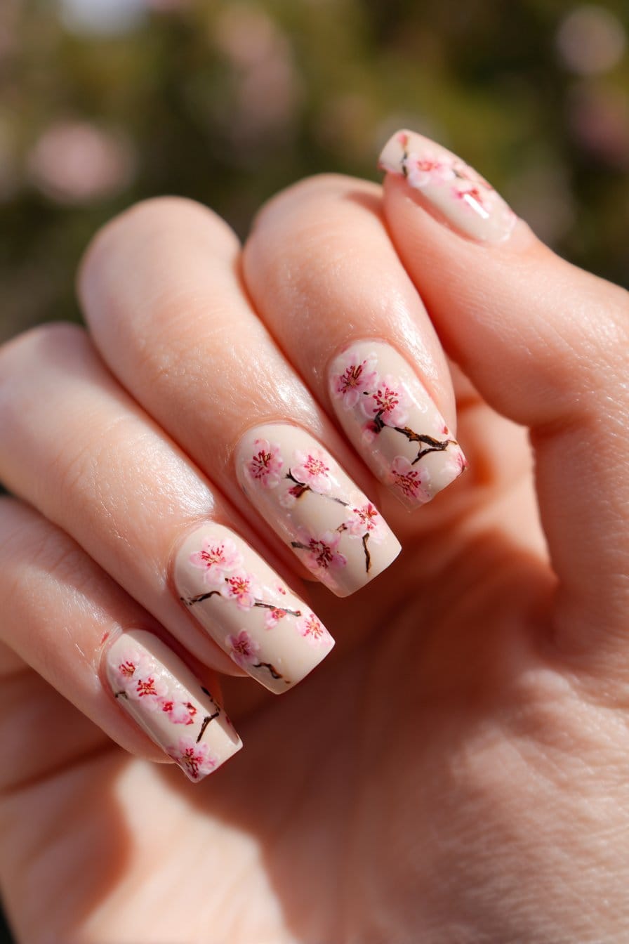 You can go for a couple of accent nails or scatter blossoms lightly across all ten. Works whether your nails are short or long, honestly.