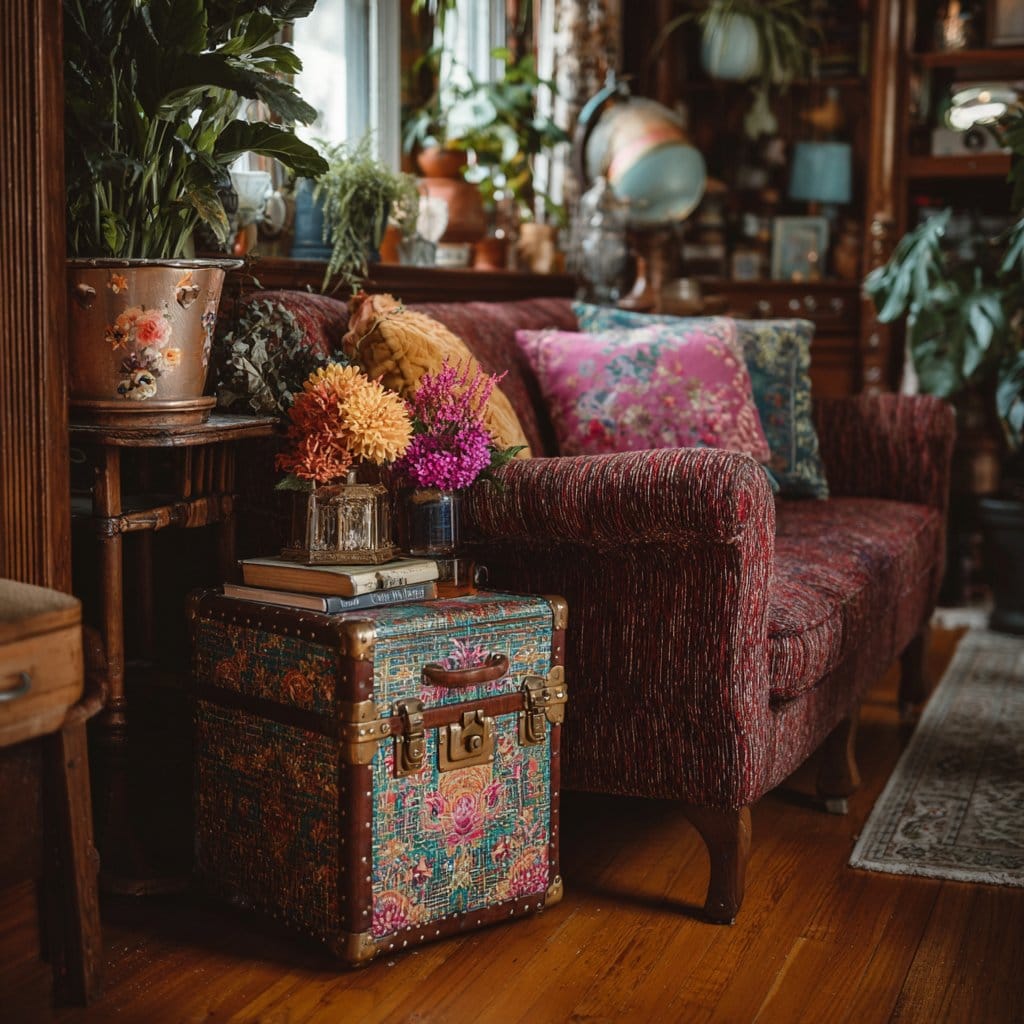 Stick a vintage trunk next to your sofa and you’ve got instant character plus hidden storage. It’s a spot for your drink or a pile of books without looking like you tried too hard.