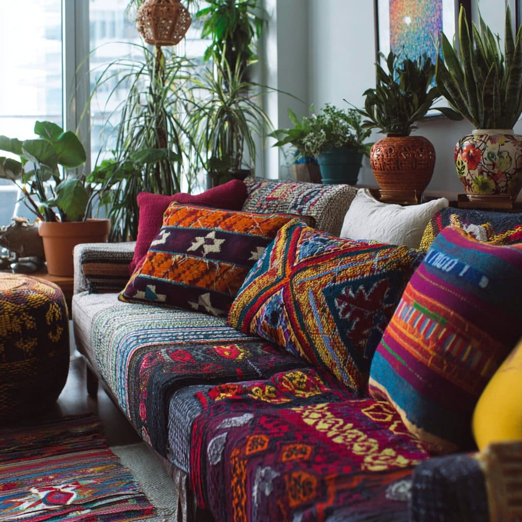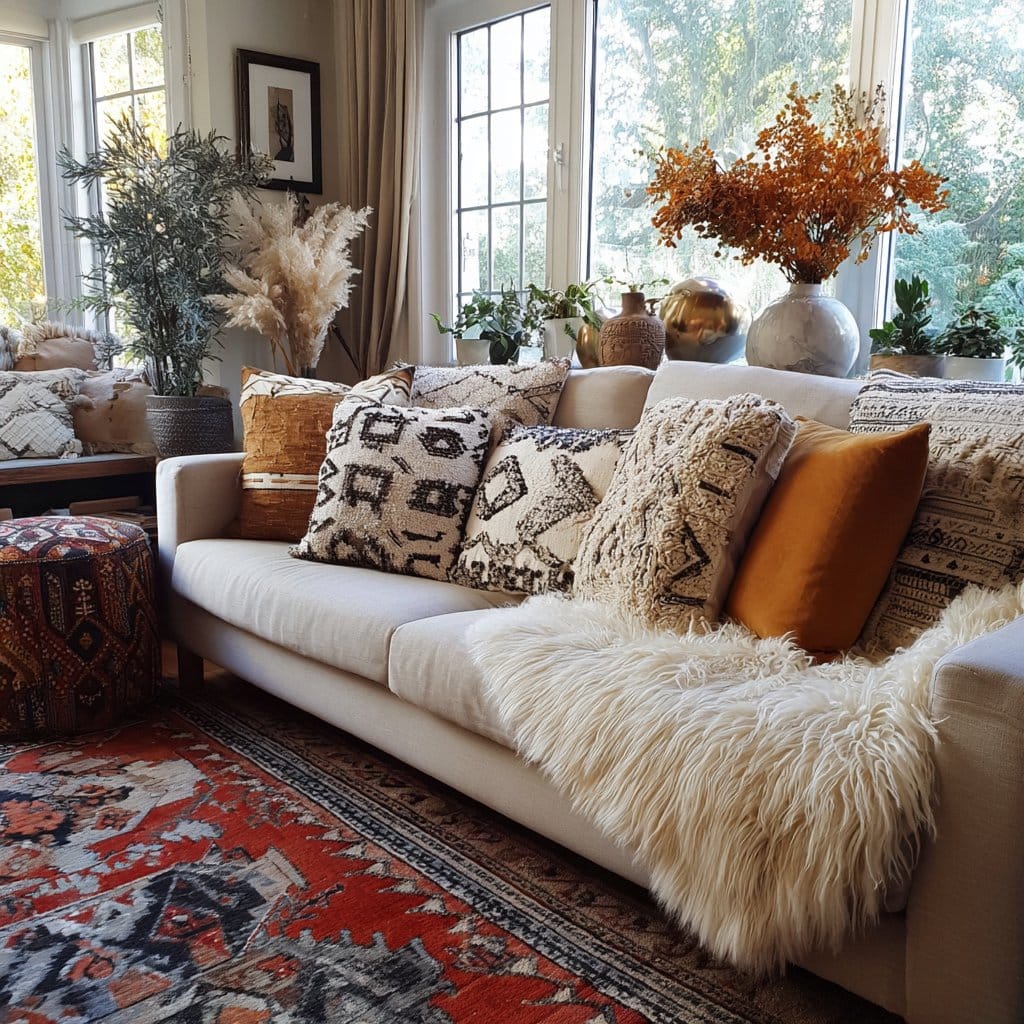 Throw pillows are the easiest way to shake things up without spending a ton. Mixing tribal prints with bold geometric shapes keeps your seating area from looking flat. You get contrast, but it still works together.
