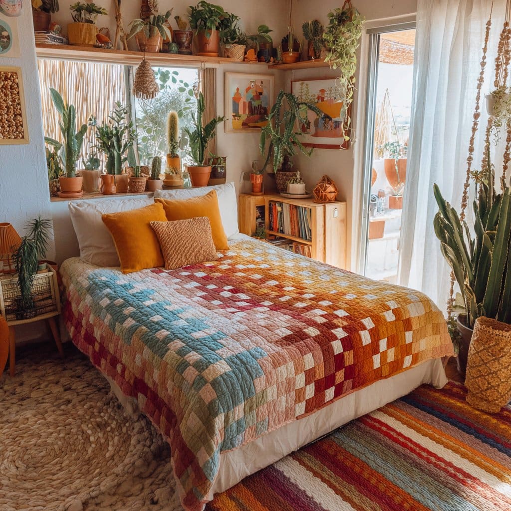 Every square’s got a different story, so your bed never looks flat or too predictable. It feels collected, raw, and a little rebellious, kind of the point in a boho space.