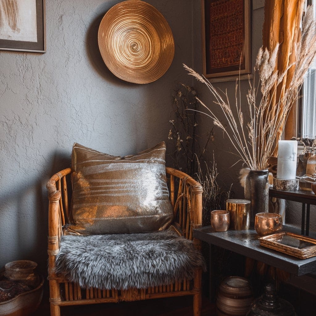 Pair shiny finishes with rough textures so the space doesn’t fall flat. A copper tray on a chunky wooden coffee table adds contrast without a lot of fuss.