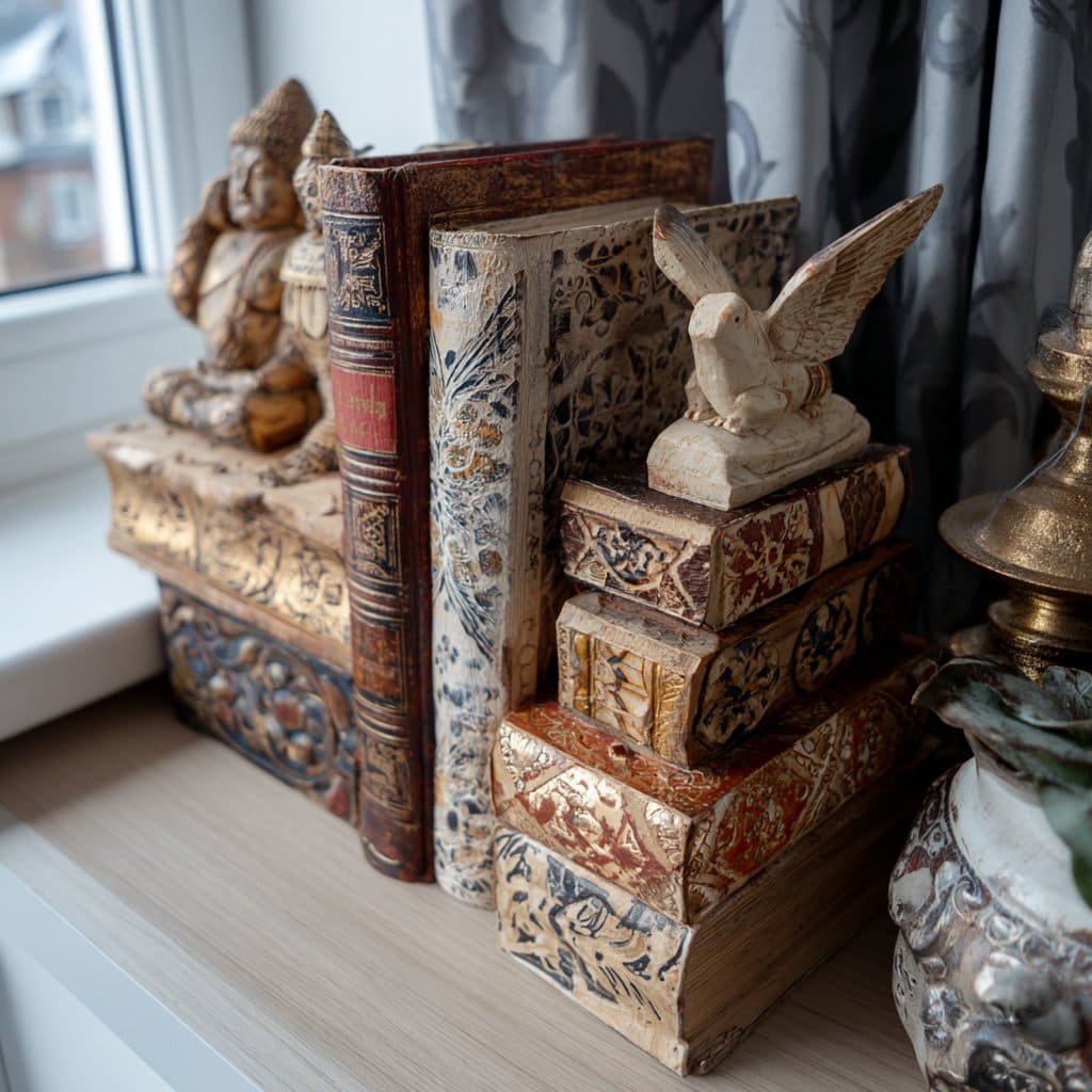 Pair them with bookends that aren’t the usual. Think brass animals, chipped stone, or even random objects like pipes or gears.