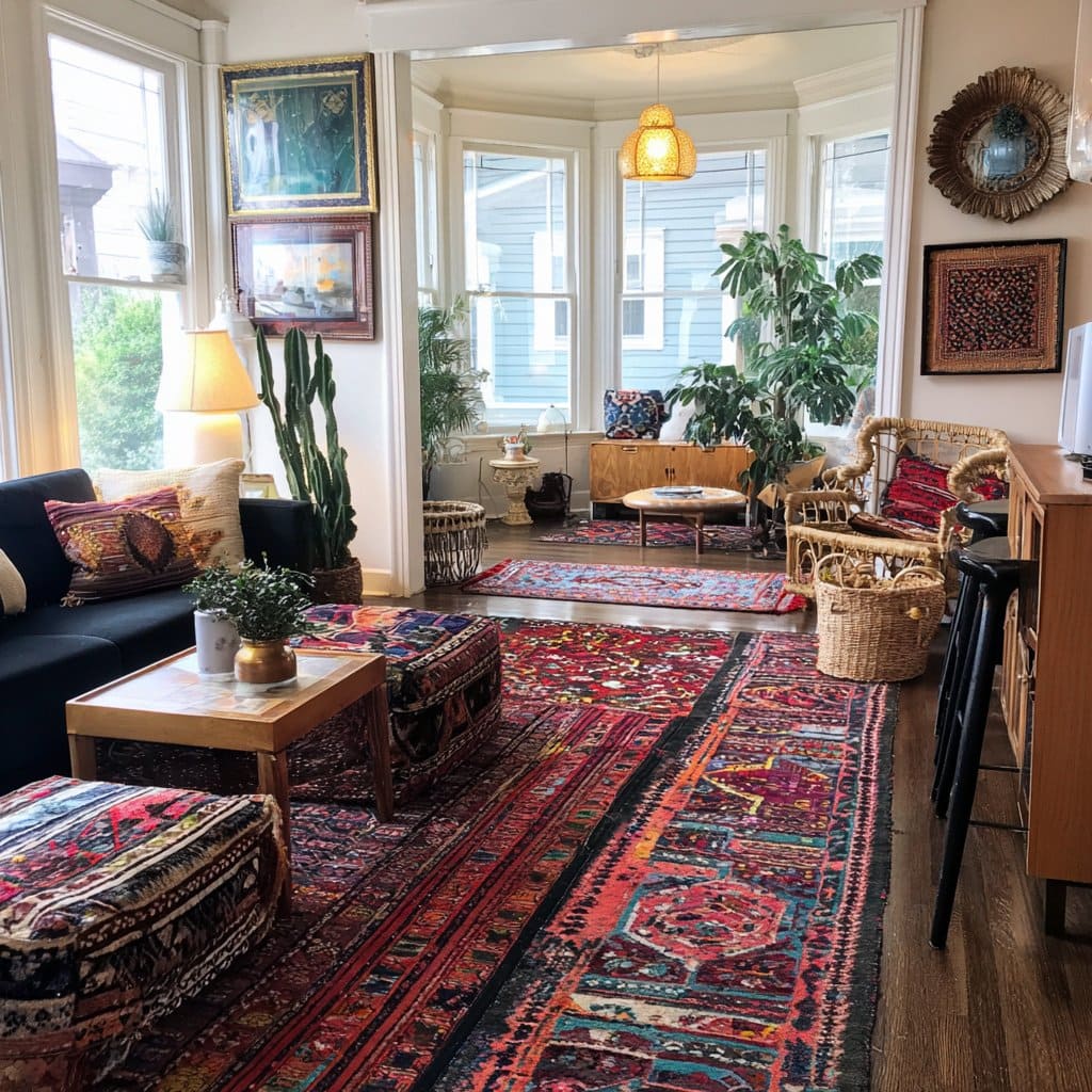 Try a big Persian carpet as the base and drop a smaller Moroccan rug over it. It adds depth and doesn’t look forced.
