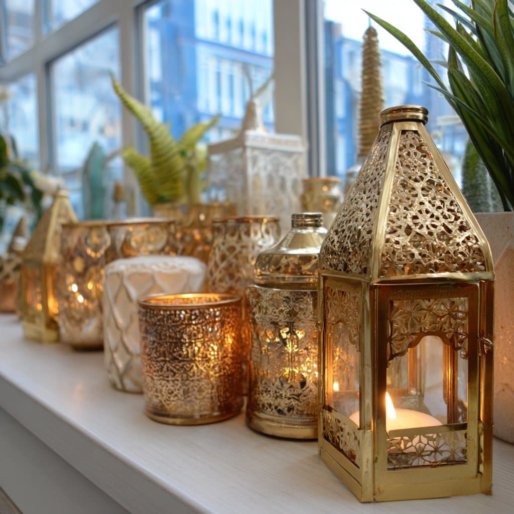 Hang up some brass lanterns with cutout patterns and watch the shadows dance on your walls. The light filtering through the metal gives your space a raw, textured look that’s anything but boring.