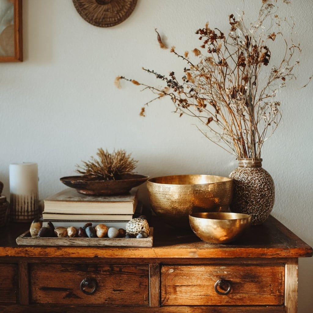 Drop a vintage brass bowl on a side table and suddenly the space has more personality. The aged metal gives off a lived-in, relaxed vibe that works well with that layered boho look.