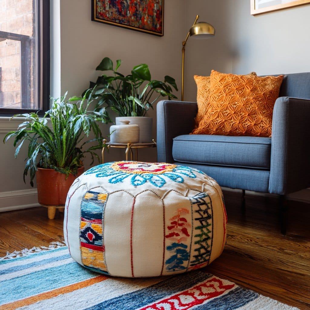 Drop a few poufs around and let the patterns do their thing. No need to match; mix stripes, geometrics, or global-inspired prints for a fun, unpredictable look.