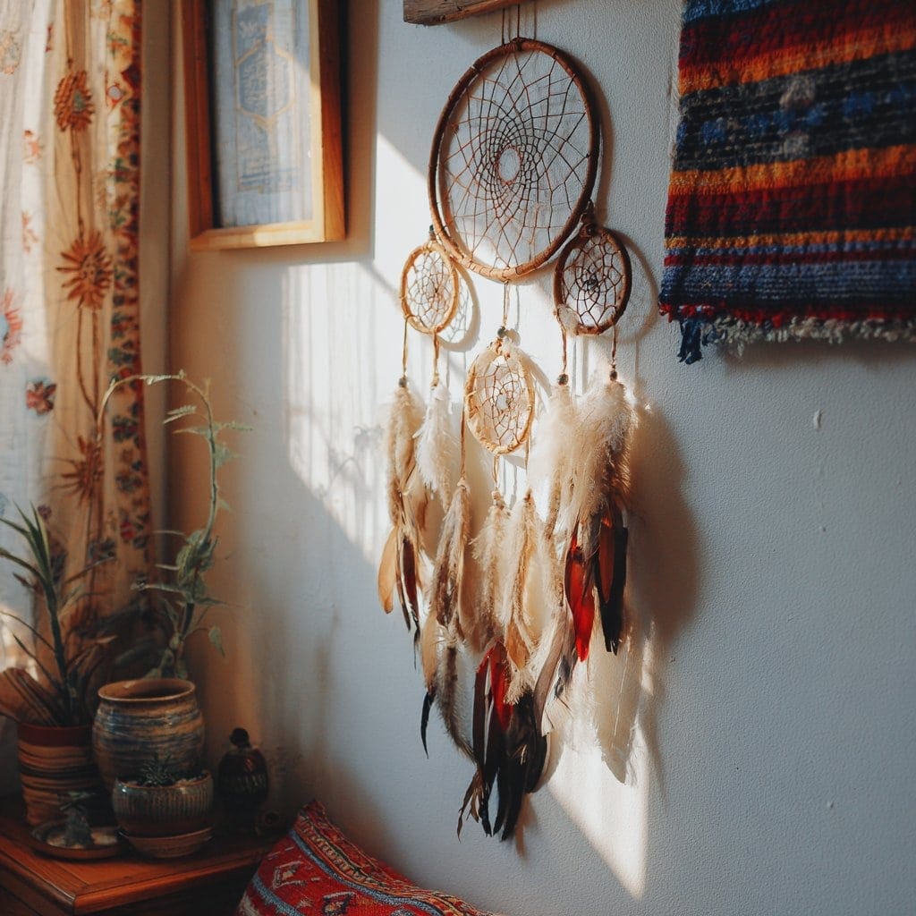 Hang up a dreamcatcher and the space gets that instant boho vibe. The feathers add a bit of movement, so it doesn’t just sit flat on the wall – it feels lively.