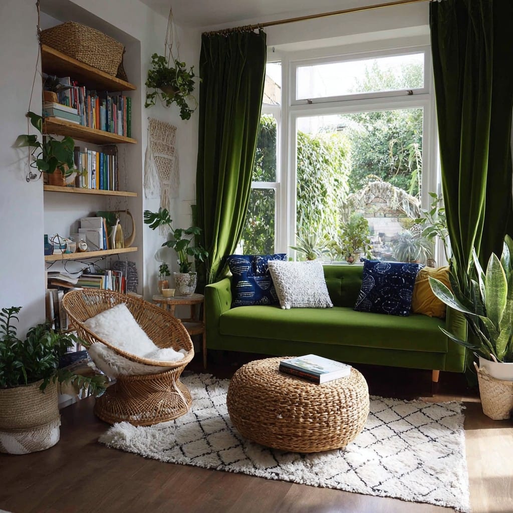 Want drama? Throw up some green velvet curtains and watch how fast your space changes. The fabric’s heavy, so it grounds the room but doesn’t feel stiff.
