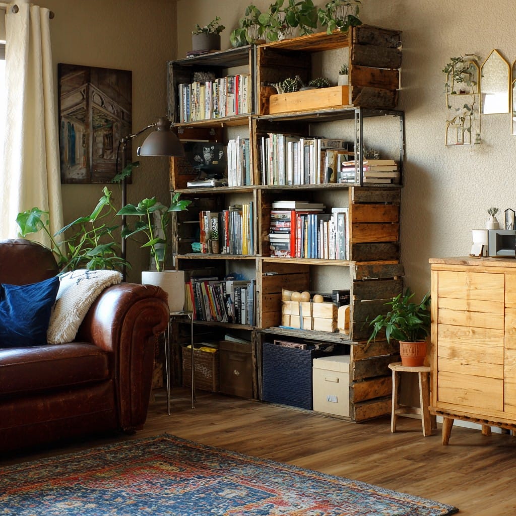 Put up some reclaimed wood shelves and your living room instantly feels more interesting. The rough textures and worn-in look add character that’s hard to fake.