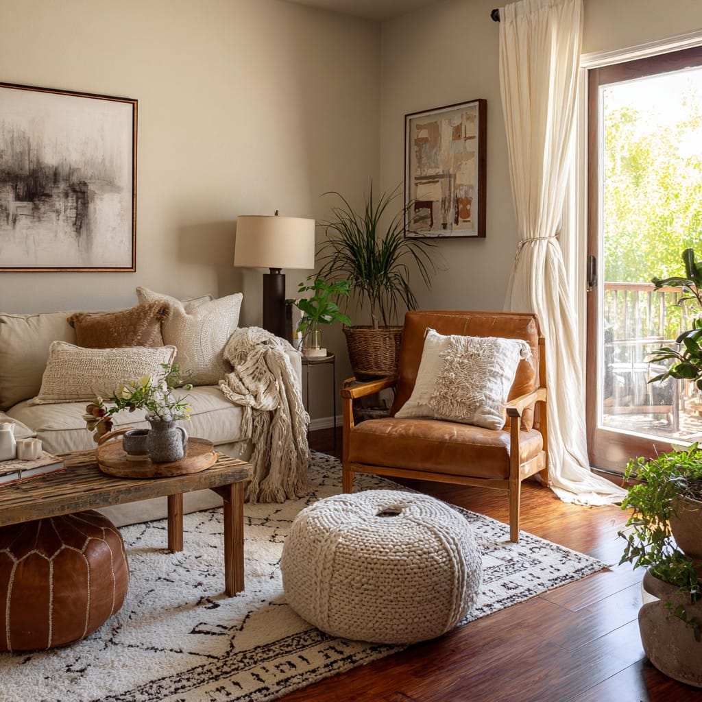 Try a leather sofa with linen cushions, or a linen chair next to a leather ottoman. The contrast feels intentional and keeps things comfy.